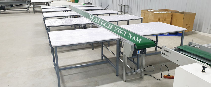 Bàn thao tác khung thép ghép cùng băng tải PVC